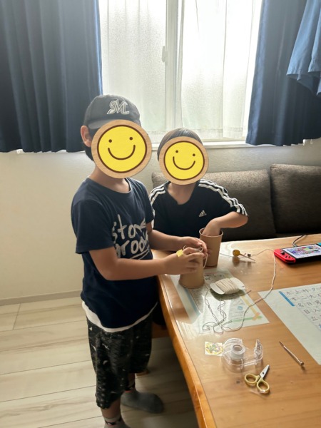 ある日曜日は、コップと糸を持ってきて、糸電話を作ってました‼️